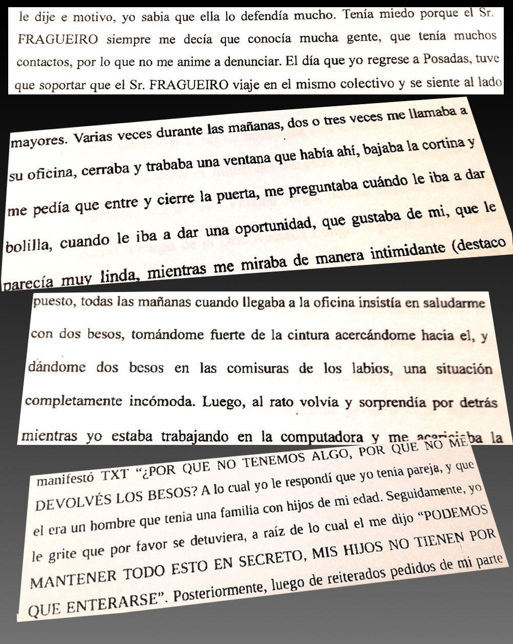 “A las 9 me presenté en el Juzgado ya que el me manifestó que debíamos hablar sobre algo. Fui a su despacho y cuando ingresé me dijo que cierre la puerta y me tomó de las manos e intentó que me sentara en su regazo y que le tocara la zona de la entrepierna, me dijo: ‘No te pongas nerviosa, besame dale besame, acá nadie nos ve, no te preocupes que nadie va a entrar’. Comencé a lagrimear y le dije que me quería ir, hasta que logré escapar y llamé a mi novio y mi abogada”.