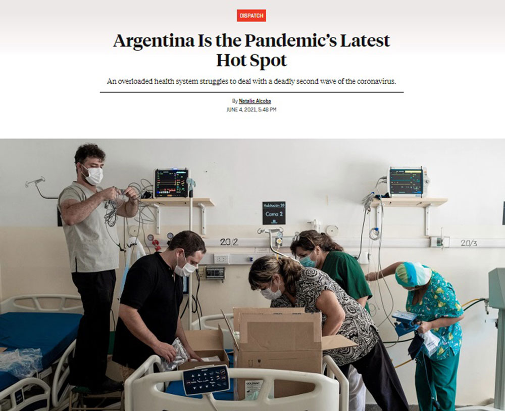 De acuerdo al informe hecho por la revista, “la perspectiva de un colapso es muy real” y citó las cifras oficiales: Argentina registró niveles récord de contagio, con un pico de 41.000 nuevos casos en tan sólo un día. El país de 45 millones de habitantes ya contabilizó más de 3,8 millones de casos y casi 80.000 muertes desde que comenzó la pandemia, con una tasa de crecimiento que tiende a aumentar incluso cuando las tasas de otros países comienzan a disminuir.