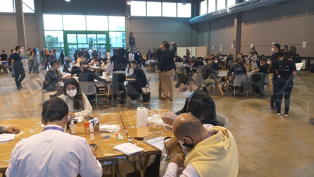 El proceso del escrutinio es bastante sencillo. En el pabellón N°3 están dispuestas las mesas en las cuales los fiscales que representando a cada uno de los frentes y partidos, respetando el distanciamiento y las normas de bioseguridad, están sentados revisando el detalle de las actas que cada presidente de mesa envió al finalizar las elecciones del domingo.