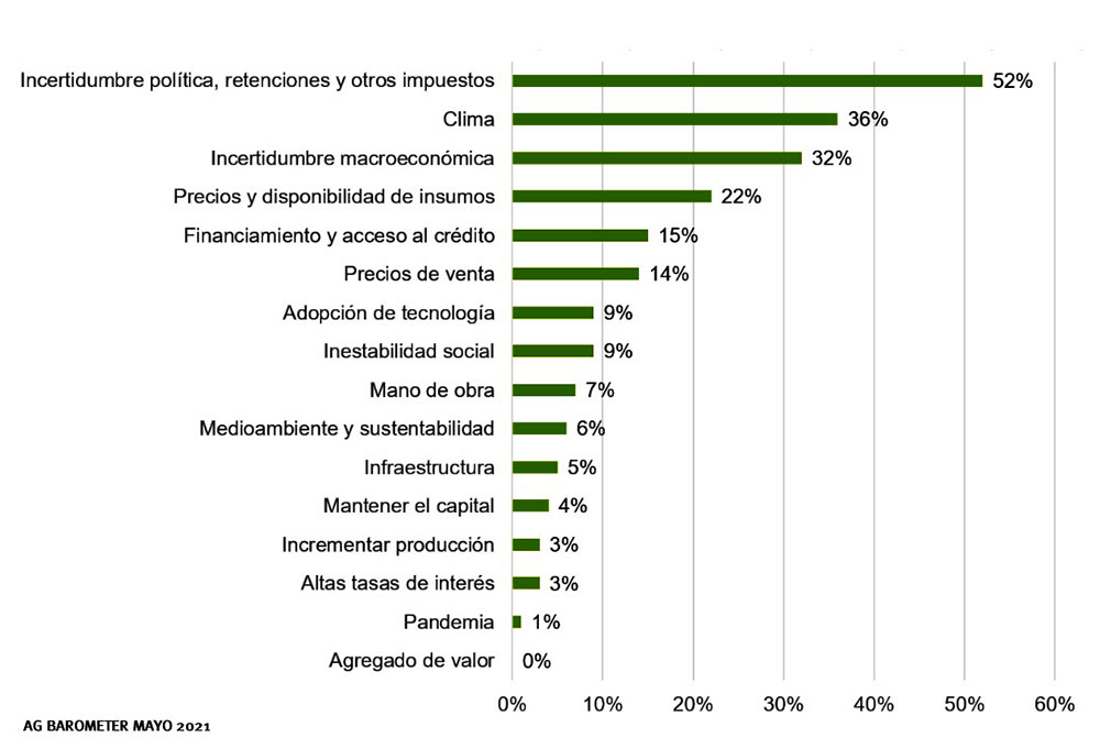 Cuando se consulta a los productores sobre las tres principales preocupaciones que tienen de aquí a un año, la incertidumbre política, las retenciones y el aumento de impuestos, sumado a la incertidumbre macroeconómica, dan como resultado un 82% de las menciones. Esto ratifica que en la Argentina no se vive el mejor clima para los negocios agropecuarios.