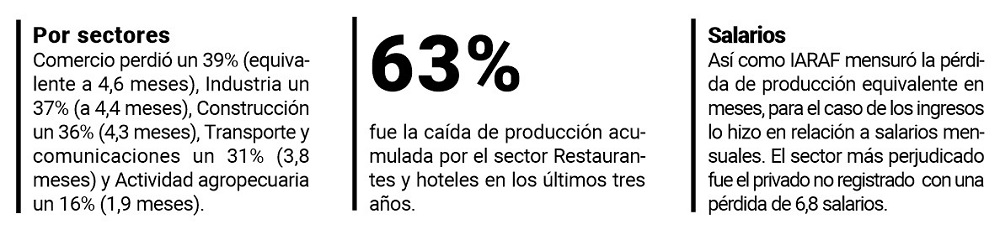Para poder cuantificar cuánto fue la caída real de la economía en los últimos años, el estudio de Iaraf tomó como referencia los doce meses entre abril de 2017 y marzo de 2018, es decir, el último año antes de que se desatara la primera crisis cambiaria que dio inicio al período recesivo que todavía continúa.