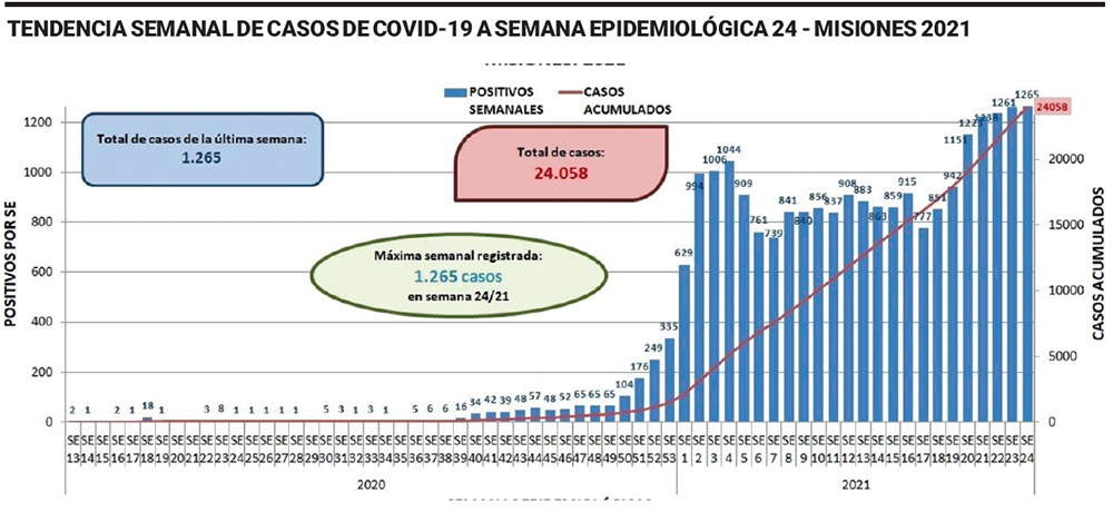 Mientras que en el país, por tercera semana consecutiva, disminuyeron los contagios en forma sostenida (se registró un 10% menos de positivos de la semana epidemiológica 20 a la 21, un 12% menos de la semana 21 a la 22 y un 22% menos de la 22 a la 23, según el Ministerio de Salud de la Nación), Misiones es una de las pocas provincias cuya tendencia de casos y fallecidos sigue en aumento.