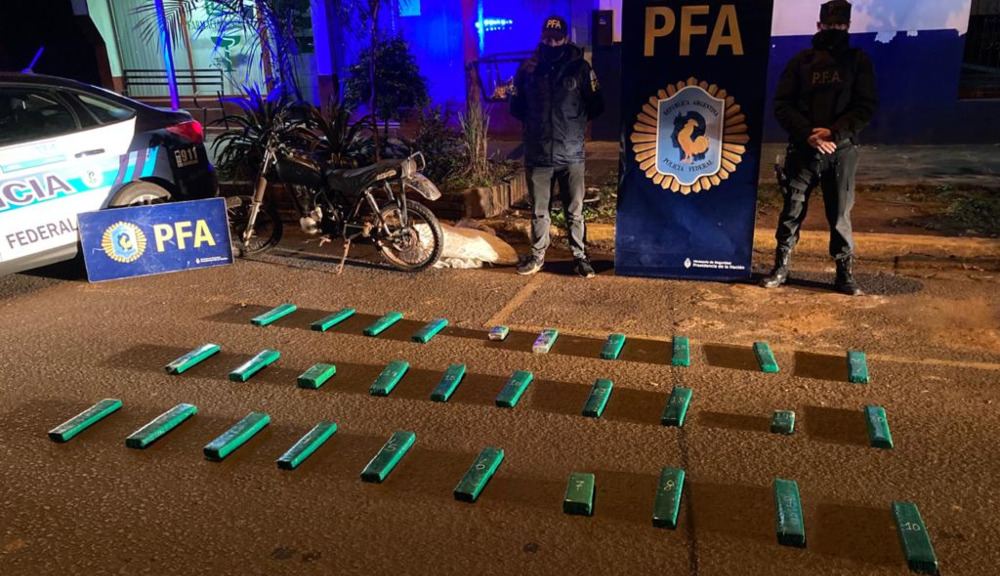 Un motociclista abandonó una carga de más de 20 kilos de marihuana y se dio a la fuga por una zona de monte, tras ser perseguido por la personal de la Policía Federal Argentina en Puerto Iguazú.