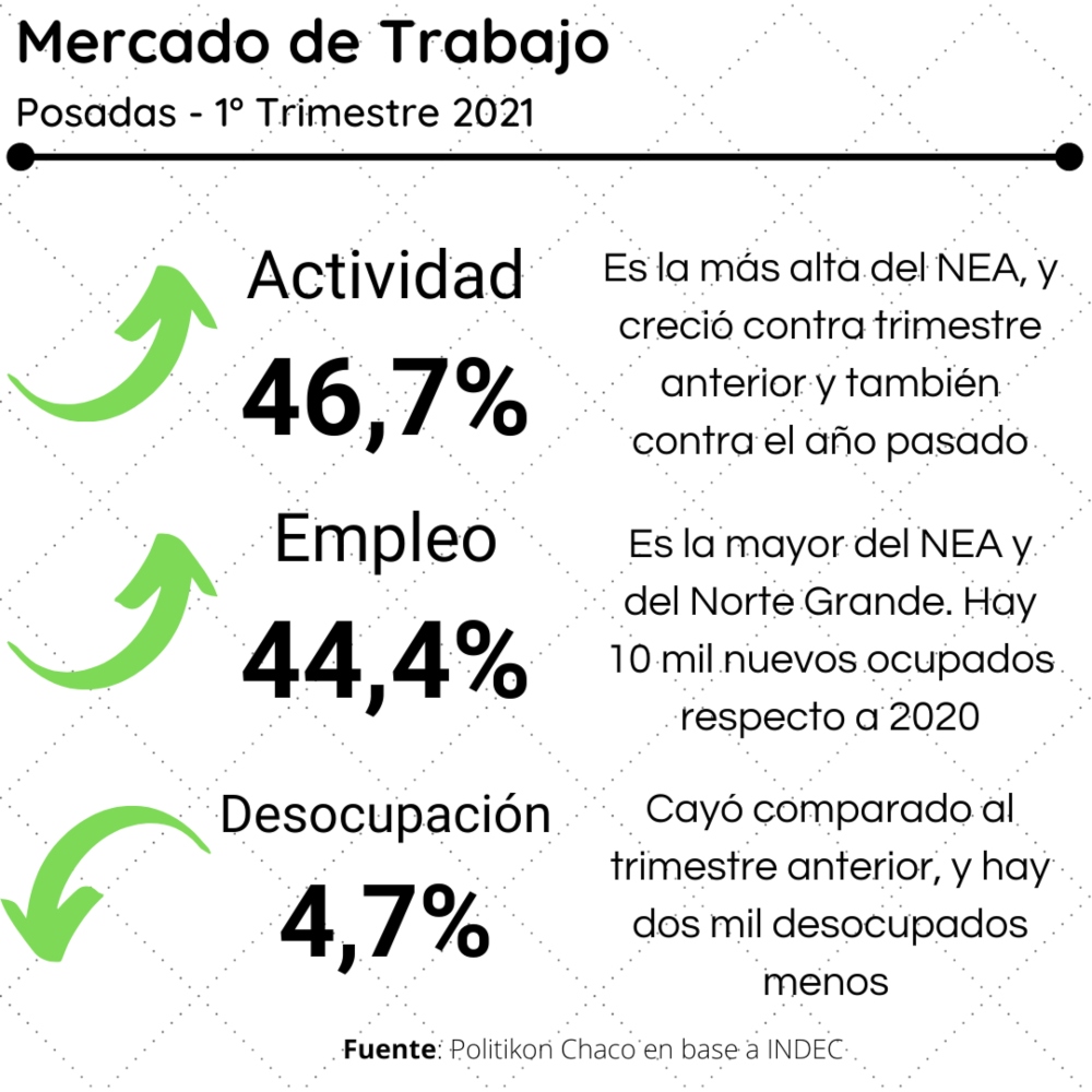 El aglomerado Posadas se consolida como uno de los mejores del NEA con respecto al mercado de trabajo. Es que, en el primer trimestre del 2021 y por tercer consecutivo, se incrementó la actividad y el empleo, con una baja en la desocupación, destacó la consultora Politikon Chaco en un informe, en base a datos del INDEC.