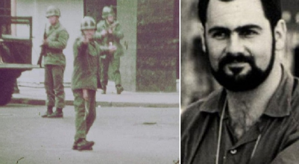 En la fotografía se puede apreciar el instante en el que él mismo filmaría el desenlace de su vida cuando justamente ese soldado que le está apuntando le dispara hiriéndolo de muerte.