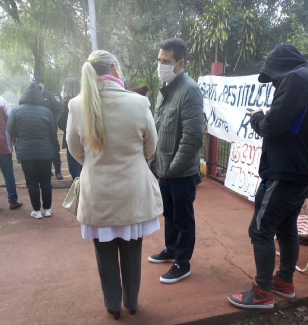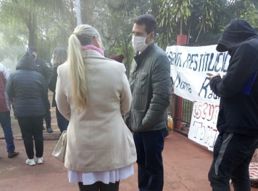 Padres de alumnos de la Escuela 468 Juana Manso de Eldorado, protestan frente a la escuela por posible nombramiento del ex secretario Escolar Eduardo Medera en reemplazo de la docente Norma Radke, quien actualmente ocupaba el cargo y era suplente de la directora titular María Sawaryn.