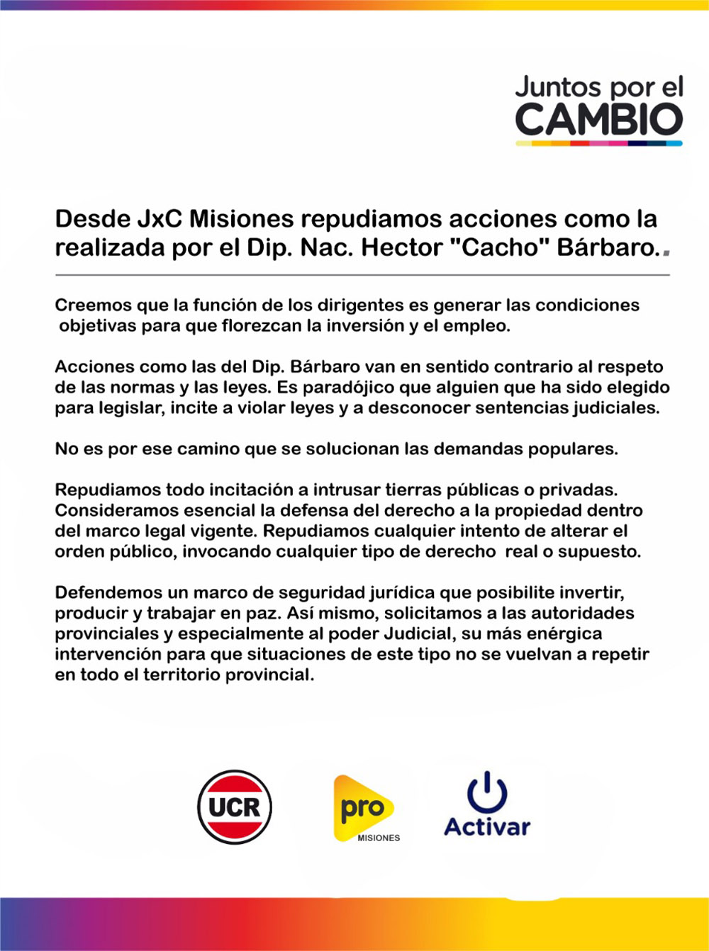 “Acciones como las del Dip. Bárbaro van en sentido contrario al respeto de las normas y las leyes. Es paradójico que alguien que ha sido elegido para legislar, incite a violar leyes y a desconocer sentencias judiciales“, señala el comunicado, y agrega que “No es por ese camino que se solucionan las demandas populares“.
