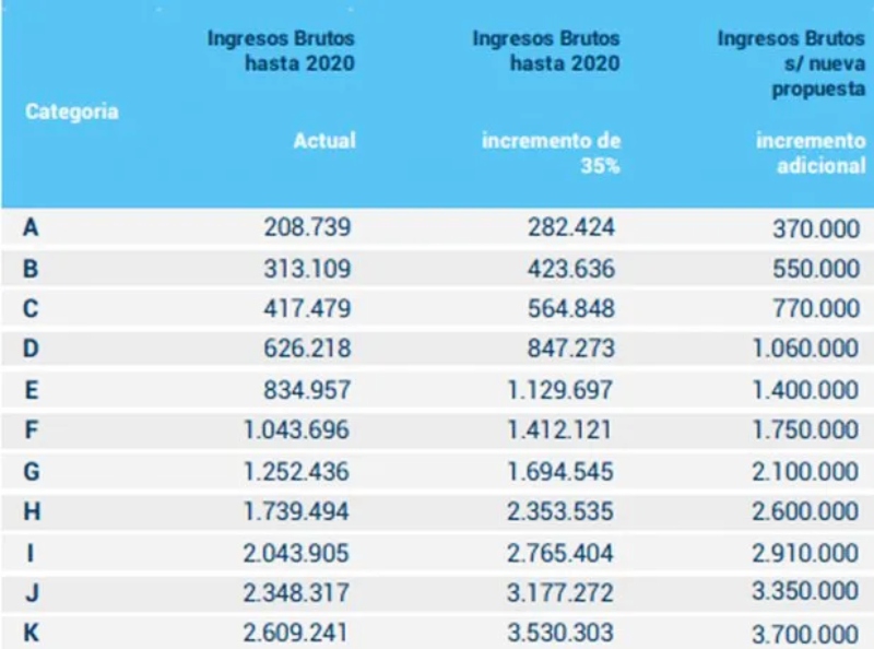 Con los cambios introducidos en el nuevo proyecto, el tope de Ingresos Brutos de la categoría “A” (la más baja de todas) que tenía que pasar de $208.739 a $282.424, quedará en $370.000.