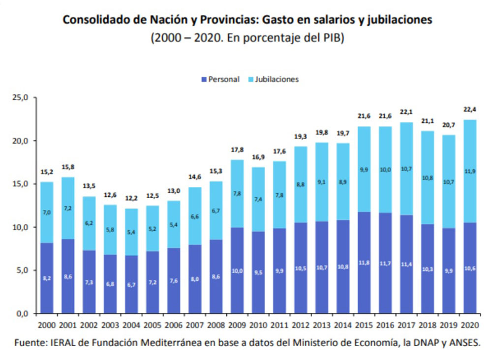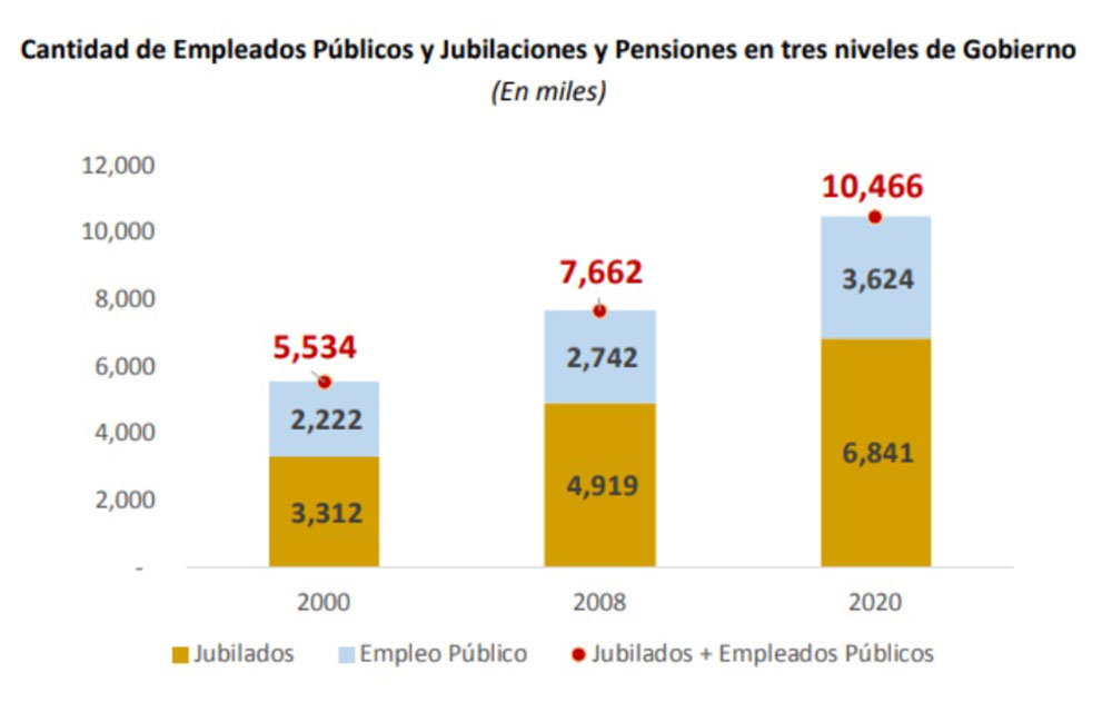 De acuerdo con un análisis de la Fundación Mediterránea del 2000 al 2020 se pasó de 2,2 millones a 3,6 millones de agentes públicos en los tres niveles (nacional, provincial y municipal) en tanto la cantidad de jubilados subió de 3,3 millones a 6,8 millones, totalizando entre ambos un alza de 5,5 millones a 10,6 millones de personas.