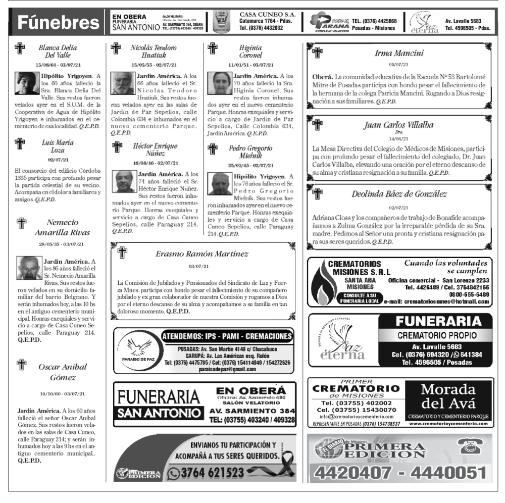Fúnebres del domingo 4 de julio de 2021