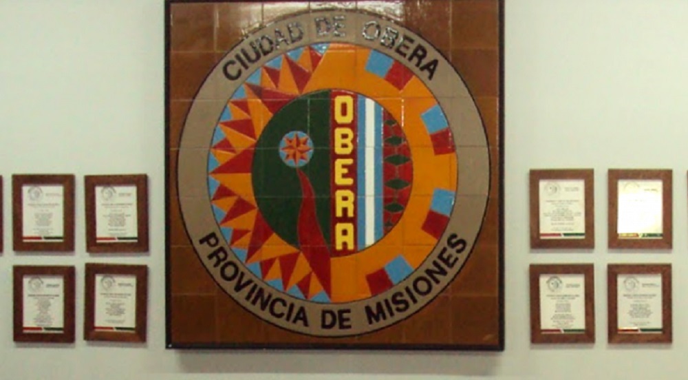 Existe otro círculo mayor que recubre al anterior, color marrón claro cuya parte superior puede leerse con letras negras la inscripción: “Ciudad de Oberá, Provincia de Misiones”.