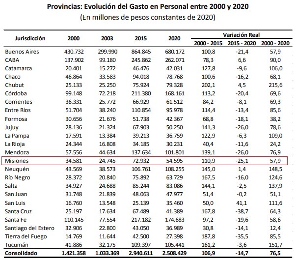 El Gobierno de Misiones ajustó un 25% su gasto salarial del sector público provincial en el período 2015 – 2020, de acuerdo a un reciente informe del Instituto de Estudios Económicos sobre la Realidad Argentina y Latinoamericana (IERAL) perteneciente a la Fundación Mediterránea donde se tomaron los montos a precios constantes de 2020.