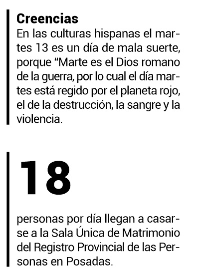 El amor pudo más, y se casaron el martes 13. Liliana Fernández (39) y Ángel Barrios (42) dieron el sí en el día más supersticioso del año. Sucedió ayer por la tarde en las oficinas de la Sala Única de Matrimonio del Registro Provincial de las Personas, y fue el único casamiento en todo Misiones, desafiando las creencias y tradiciones de este día, que según los supersticiosos trae mala suerte.