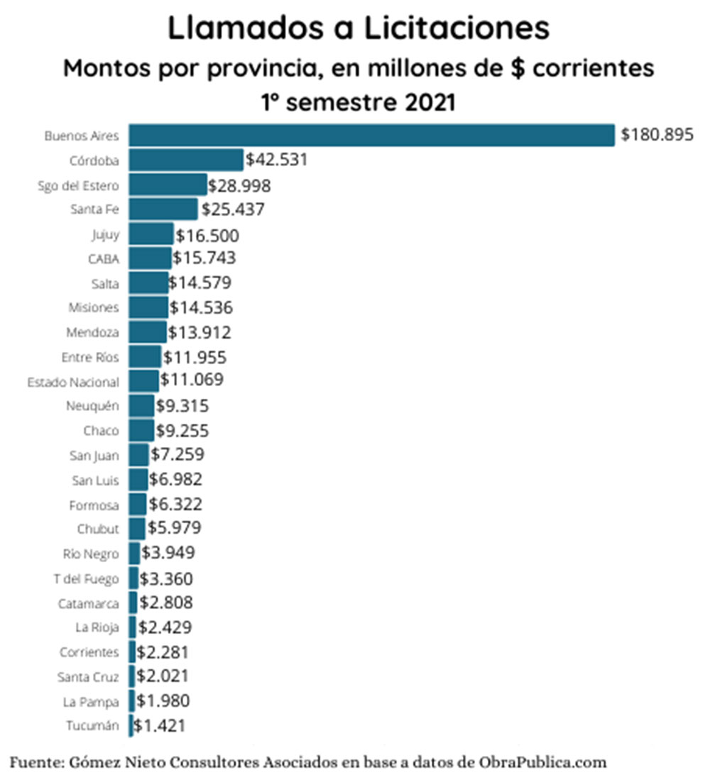 Los datos surgen de un informe de Gómez Nieto Consultores Asociados en el que consideraron “todos los llamados a licitaciones de obras publicados por el Estado nacional, las provincias y municipios durante el período enero-junio 2021”.