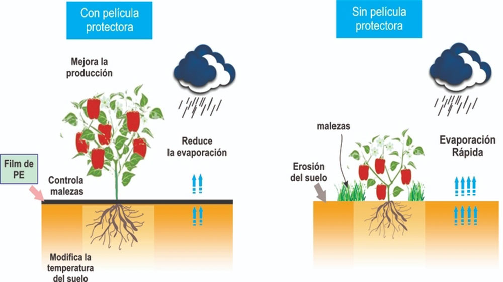 En este sentido, añadió que la utilización de estas películas flexibles es una práctica que trae numerosos beneficios para el crecimiento y la productividad de los cultivos, dado que ayuda a controlar malezas e insectos, reduce la evaporación del agua de riego y evita el contacto directo de frutas o verduras con el suelo cultivado.