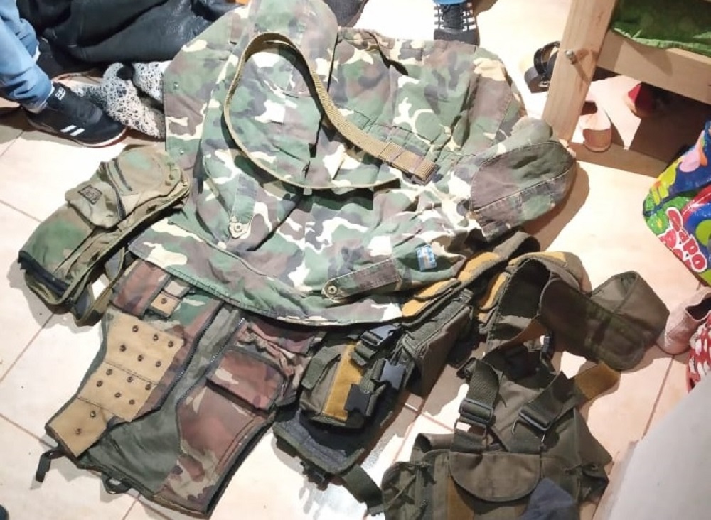 En otro inmueble de Puerto Rico, del cruce de calles El Eucaliptal y 12 de Octubre en el barrio San Miguel, fue atrapado otro de los sospechosos, de 35 años, y en su vivienda se hallaron una pistola cargada Browning calibre nueve milímetros, dos cargadores completos del mismo calibre, una decena de balas en uno de los tres chalecos similares a los que utilizan militares israelíes, una gorra de la Policía de Buenos Aires, chaquetillas con inscripciones Ejército Argentino, pantalones camuflados y una caja con proyectiles nueve milímetros, otra con veinte calibre 22, dinero en efectivo y celulares.