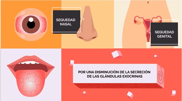 Los síntomas clínicos principales están relacionados con la destrucción de las glándulas exocrinas y son: la sequedad ocular (xeroftalmia) por disminución de la secreción lacrimal, la sequedad bucal (xerostomía) por disminución de la secreción de saliva y la sequedad nasal y vaginal. Esta es la forma leve de afectación, que a su vez es la más frecuente.
