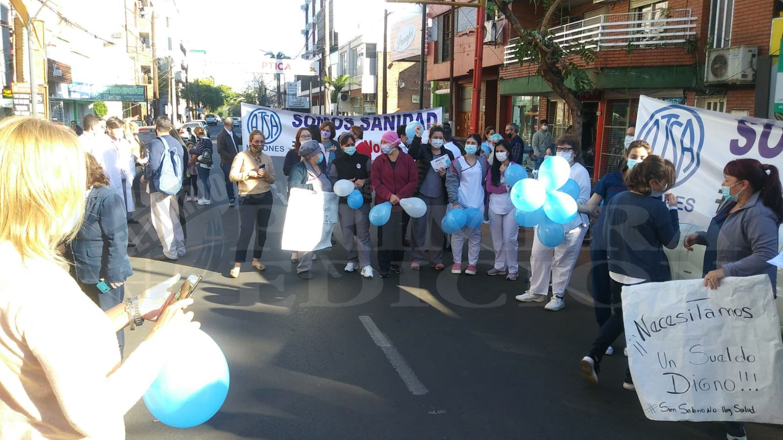 Tras la falta de acuerdo en la negociación por un aumento salarial, este viernes los trabajadores de la salud privada de todo el país hicieron un paro de cuatro horas por turno. En Posadas, además de adherir a la medida nacional, los trabajadores se movilizaron por las calles céntricas.