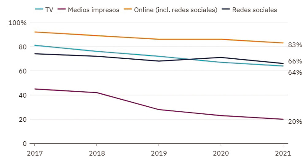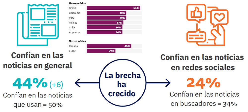 En términos globales, y después de dos años de abrupta caída, la confianza en las noticias se ha incrementado con la pandemia: el 44% confía en la mayoría de las noticias la mayor parte del tiempo. Sin embargo, se mantiene estable la confianza en las noticias halladas en motores de búsqueda y en redes sociales, lo que significa que las audiencias parecen dar más importancia a las fuentes rigurosas y fiables.