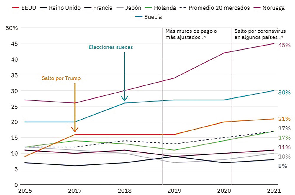 Otro fenómeno destacado es el significativo incremento en el pago por noticias online en los países occidentales más ricos, aunque el porcentaje general a nivel mundial permanece bajo.