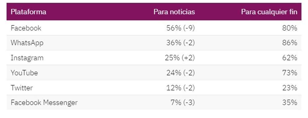 Sin embargo, se mantiene fuerte el uso de redes sociales para consumir noticias, sobre todo entre los jóvenes y quienes poseen niveles educativos más bajos. Las aplicaciones de mensajería como Whatsapp y Telegram se han vuelto especialmente populares en el Sur Global, lo cual ha generado más inquietud en torno a la propagación de desinformación.