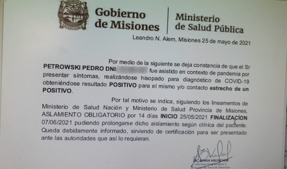 CERTIFICADO. Por COVID positivo Pietrowski no fue juzgado el 3 de junio.