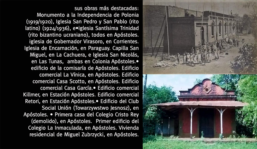 Entre sus obras más destacadas se pueden mencionar el monumento a la Independencia de Polonia (1919/1920), en Apóstoles; la iglesia San Pedro y San Pablo (rito latino) (1924/1936), un templo emblemático para los apostoleños; la iglesia Santísima Trinidad (rito bizantino ucraniano), en Apóstoles; la iglesia de Gobernador Virasoro (rito latino), en Corrientes; la iglesia de Encarnación (rito latino), en Paraguay; la capilla San Miguel, en La Cachuera, Colonia Apóstoles; la iglesia San Nicolás, en Las Tunas, Colonia Apóstoles, y el edificio de la comisaría de Apóstoles. También los edificios comerciales La Vínica, Casa Scotto, Casa García, Killmer, comercial Retori, ambos en Estación Apóstoles. El edificio del Club Social Unión (Towarzywstwo Jesnosz), en Apóstoles; la primera casa del Colegio Cristo Rey (demolido), el primer edificio del Colegio La Inmaculada, y la vivienda residencial de dos plantas de Miguel Zubrzycki, todos en Apóstoles.