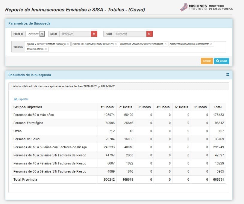 De acuerdo al Sistema Integrado de Información Sanitaria Argentino (SISA), la Provincia aplicó un total de 665.831 entre dosis uno y dos, con las diferentes vacunas, incluyendo a todas las poblaciones.
