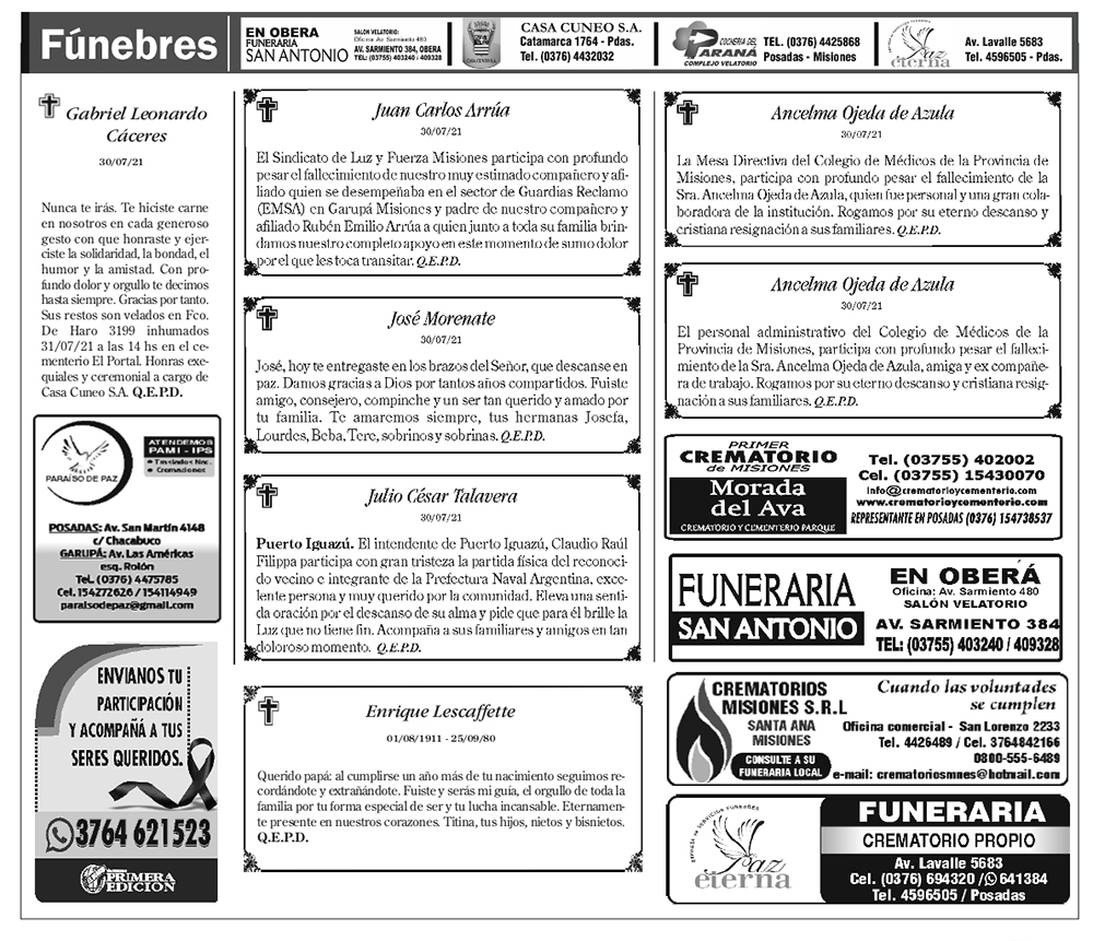 Fúnebres del Domingo 1 de Agosto de 2021