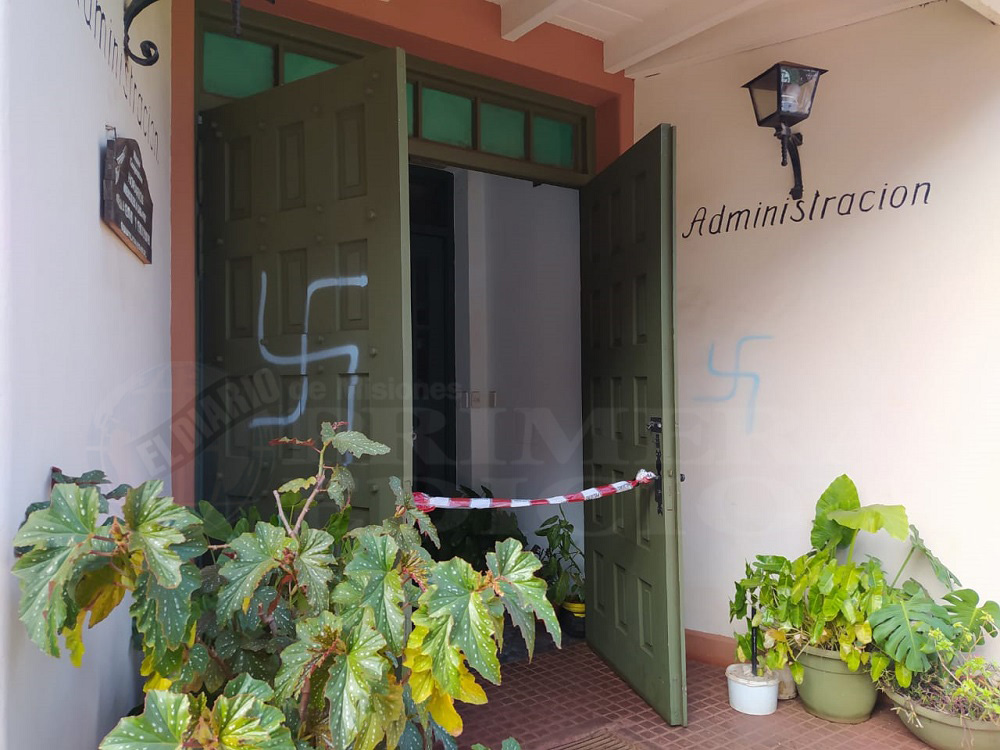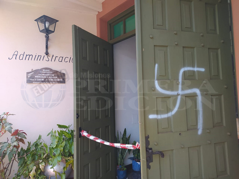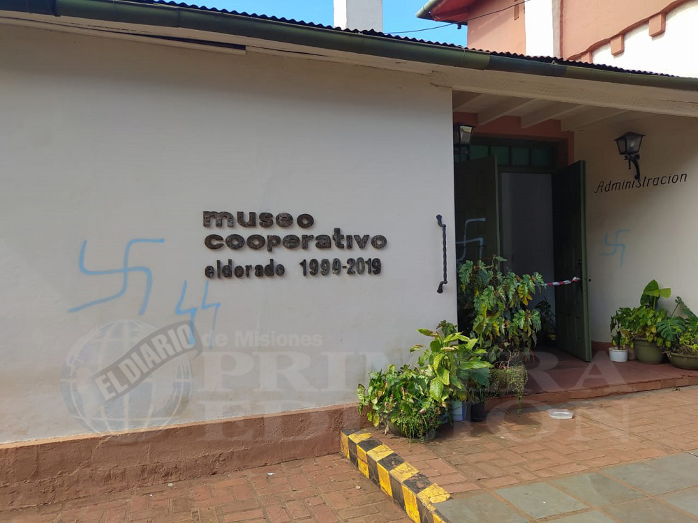 La responsable del Museo Cooperativo de la Cooperativa de Electricidad de Eldorado Limitada (CEEL), sobre la avenida San Martín en el Kilómetro 9 de esta ciudad, denunció que, entre las 16:30 del miércoles y las 7 de este jueves, alguien había pintado con aerosol varias esvásticas en las paredes laterales y la puerta de ingreso del establecimiento.