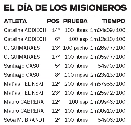 El posadeño conquistó el segundo puesto en los 100 metros libres con un cronómetro de 54s06/100, por detrás del santafesino Matías Santiso, quien se llevó la prueba con un tiempo de 52s21/100. En esa prueba también se destacó el obereño Santiago Caso (18), quien fue quinto con un registro de 54s70/100.