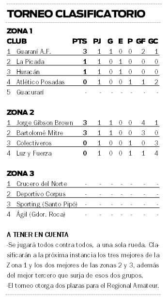 La primera fecha del Torneo Clasificatorio de la Liga Posadeña, que arrancó con la goleada de Brown sobre Luz y Fuerza y el empate entre La Picada y Huracán, cerró con sendas victorias de Guaraní y Mitre.