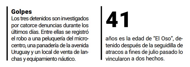 Cabe recordar que en el marco de esta causa, el pasado 28 de julio fue detenido un hombre de 61 años en su domicilio de la chacra 240. Este sospechoso, ya con prontuario por este tipo de delitos, había quedado filmado cuando ingresó con fines ilícitos a una panadería de la avenida Uruguay y a un local del rubro náutica de la misma avenida.