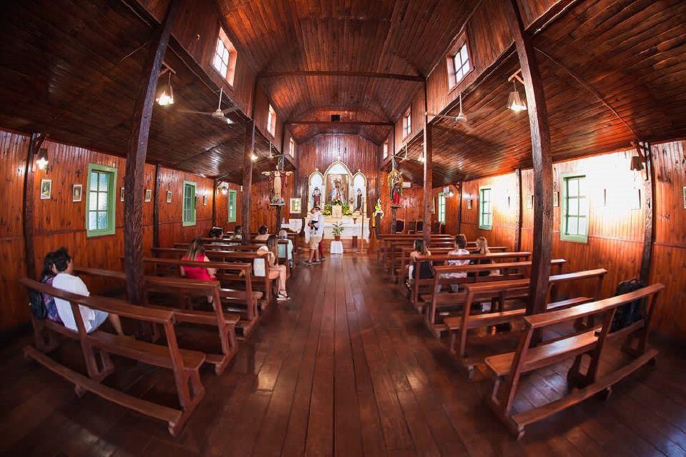 Cuentan que entre los inmigrantes llegados a estos lares había varios carpinteros, por ello la capilla fue construida en su totalidad de madera y varias de sus columnas labradas a mano.