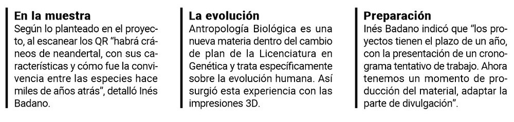 Badano detalló que la idea de esto llegó “como parte de la Licenciatura en Genética, tenemos una unidad de evolución humana y desde la experiencia en clase con los chicos surgió la idea de implementar otros materiales, más allá de los libros, para despertar un interés sobre el estudio de la evolución humana. En la cátedra comenzamos con las réplicas de estos fósiles mediante la tecnología 3D”.