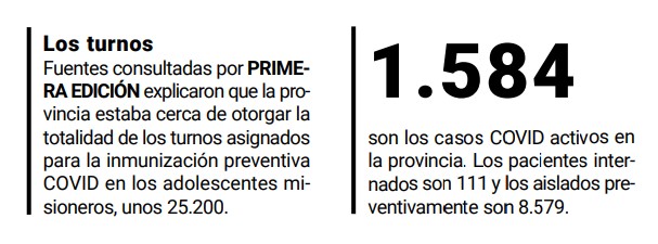 Según el informe de la Sala de Situación del Ministerio de Salud Pública de Misiones del 16 de agosto, la ocupación de camas en las áreas críticas es del 47,80%. Este reporte sanitario da cuenta que, de un total de 205 camas del sistema sanitario, 98 fueron ocupadas por los internados en Unidad de Terapia Intensiva (UTI). En total, son 107 las camas que se encuentran disponibles.