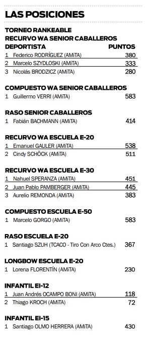 En cuanto a la competencia, el primer turno fue para los 17 arqueros federados que participaron del Rankeable de FATARCO. Los ganadores del torneo fueron Federico Rodríguez en Recurvo WA Senior Caballeros; Guillermo Verri en Compuesto WA Senior Caballeros; en Raso Senior Caballeros fue Fabián Bachmann y Emanuel Gauler en Recurvo WA Escuela E-20. Nahuel Speranza fue el ganador en la categoría Recurvo WA Escuela E-30; Marcelo Gorgo en Compuesto Escuela E-50 y Jonathan Kroch en Raso Escuela E20. Santiago Szuh, el representante correntino, venció en Raso Escuela E-30; Lorena Florentín en Longbow Escuela E-20; Juan Ocampo en Infantil Ei-12 y Santiago Olmo Herrera en Infantil Ei-15.
