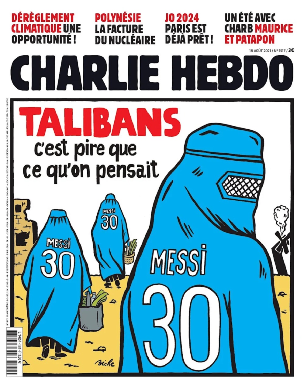 En una nueva tapa de la polémica y provocadora revista Charlie Hebdo se puede ver la imagen de tres mujeres usando burkas azules, con el apellido Messi y el 30, su nuevo número en el Paris Saint Germain, acompañado de la frase: “Los talibanes son peores de lo que pensamos”.