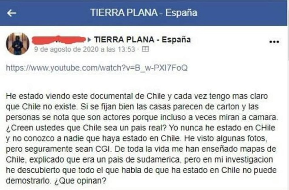 “He estado viendo un documental de Chile y cada vez tengo más claro que el país no existe. Si se fijan bien, las casas parecen de cartón y las personas se nota que son actores porque incluso a veces miran a cámara”, comienza el posteo que hizo un usuario en Tierra plana – España, un grupo de Facebook donde terraplanistas se reúnen a intercambiar mensajes.