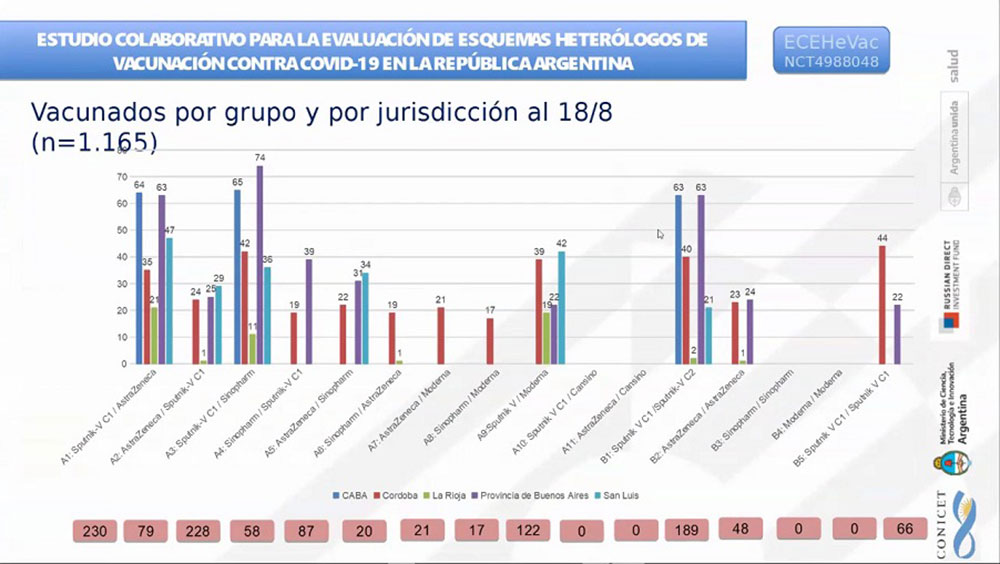 Cada jurisdicción contará con 560 participantes, la mitad de ellos mayores de 60 años y la otra mitad de 18 a 59 años. Ambos grupos etarios participan de las distintas ramas del estudio que contempla 16 combinaciones posibles. Fue Ciudad de Buenos Aires la primera en iniciar los ensayos el 12 de julio y por lo tanto en obtener los primeros resultados preliminares. Le siguió provincia de Buenos Aires el 19 de julio, mientras que San Luis, Córdoba y La Rioja comenzaron a vacunar este mes.