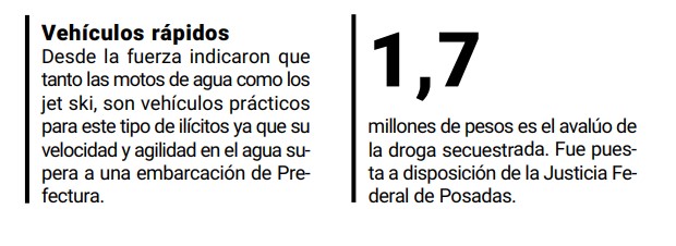 De acuerdo a la información suministrada por Prefectura, cerca de las 23 del miércoles detectaron que una moto de agua se aproximaba a la zona urbana de Posadas atravesando el río desde Paraguay y en cuestión de minutos, dejó un bulto y escapó porque se sabía cercado por una embarcación de Prefectura que merodeaba el lugar.