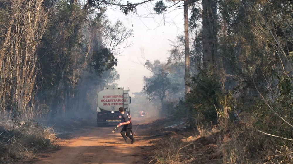 En esta calurosa tarde de invierno en Misiones se desató un voraz incendio en el Parque Provincial Araucaria, en San Pedro, donde se constituyó personal de la Policía de Misiones, Bomberos Voluntarios y el propio intendente local, Miguel Dos Santos en compañía de operarios municipales, a los que se unieron vecinos del lugar, para tratar de sofocar las llamas y que las mismas no se propaguen a las chacras lindantes.