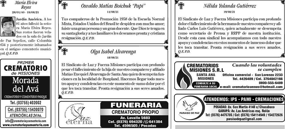 Fúnebres del viernes 20 agosto de 2021