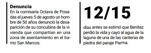 Se recolectaron voces en la zona de obradores y canteras de empresas constructoras del paraje Nemesio Parma, que lo describieron a este hombre como un cuidador del emprendimiento pero con reiterados conflictos con varias personas que derivan también de sus inconvenientes con la ingesta de alcohol. En cuanto a los restos de Benítez Escobar, anoche en la Morgue aguardaban para que sus familiares la reconocieran y lo retiraran para velatorio y sepelio.