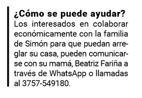 Como su hogar no está en condiciones para ser habitado, y mucho menos por un niño como Simón, actualmente están viviendo en una casa que le prestaron hasta que puedan reacondicionar la suya. “Al ser un paciente oncológico, no tiene que tener contacto con ningún virus ni bacterias. Está en una situación muy delicada”, destacó.