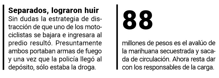 Dos motociclistas huyeron al toparse con un control policial y así dieron lugar a un importante operativo antidrogas en esta localidad. Se secuestraron casi 522 kilogramos de cannabis sativa pero no pudieron detener a los sospechosos.