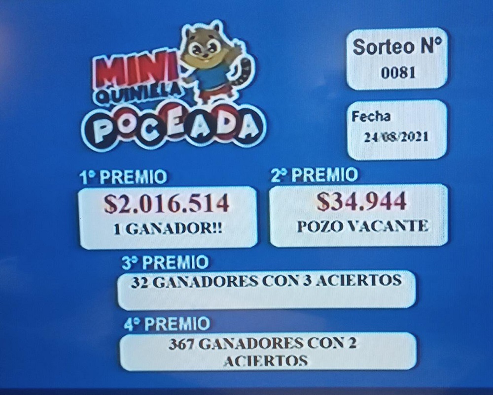 El sorteo N°81 de la Quiniela Mini Poceada Misionera, celebrado este martes 24 de agosto, deparó un ganador del primer premio, que se hizo acreedor a 2.016.514 pesos.