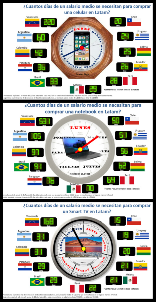 La situación es similar en el caso de un Smart TV de 43 pulgadas, para los que en el país se requieren 31 días de trabajo. Nuevamente, el trabajador argentino sólo está en mejores condiciones que el de Venezuela, que necesita 168 días, pero en peor situación que el resto de la región, ya que son necesarios 29 días de trabajo en Brasil o Paraguay, 22 días en Perú, 21 en México o Ecuador, 20 en Bolivia, 19 en Uruguay y 15 en Chile.