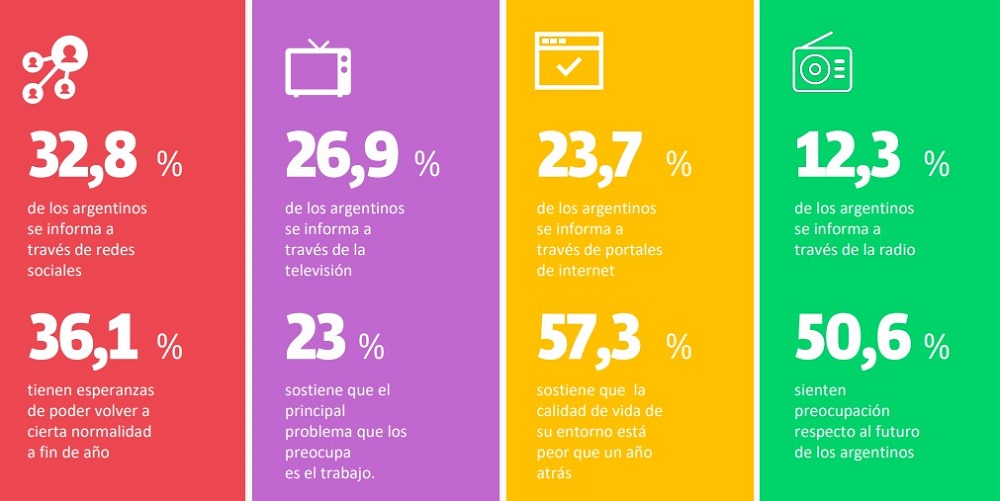 Finalmente la radio, si bien es uno de los canales de comunicación más antiguos, no ha desaparecido de la escena, aunque ocho de cada diez consumidores ya superan los 39 años, lo que da la pauta de que, en su mayoría, han atravesado las diversas etapas de la Argentina desde el retorno a la democracia. Como consecuencia, en un contexto de incertidumbre y con falencias en las instituciones, el sentimiento compartido es la preocupación en torno al futuro.