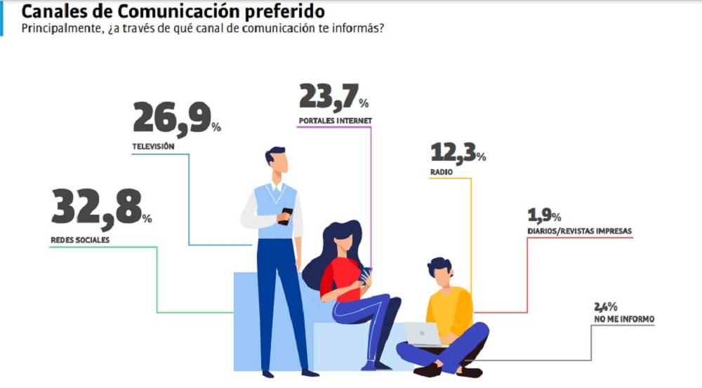 En este sentido, el dato central es que un 32,8% se informa a través de las redes sociales, mientras que un 26,9% lo hace a través de la televisión, un 23,7% mediante portales de internet y un 12,3% recurre a la radio, mientras que casi un 2% declara que directamente no se informa.